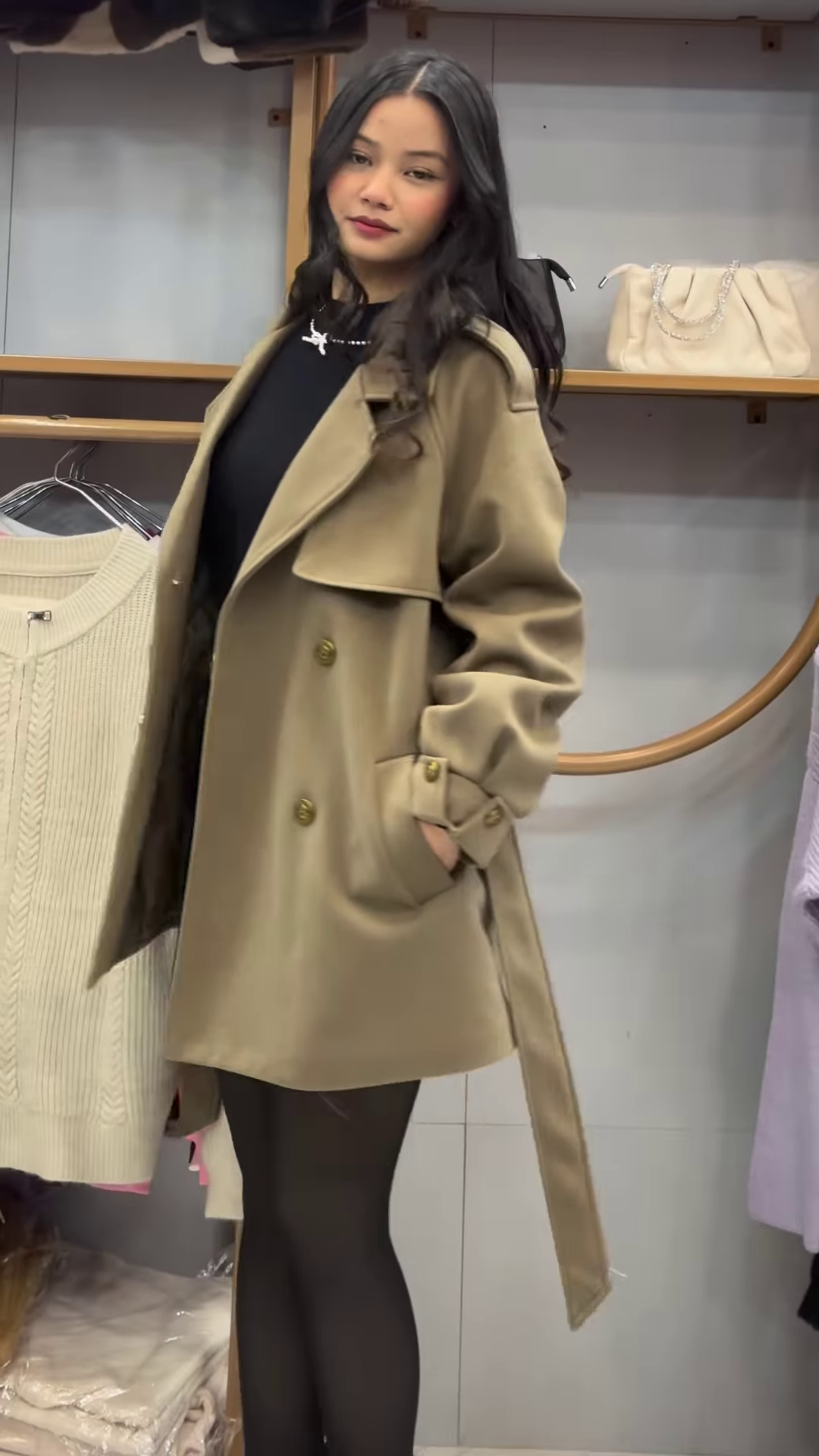Step into a world where timeless elegance meets modern sophistication with this captivating outfit that blends deep tones and refined textures. The centerpiece is a structured green trench coat, its tailored silhouette effortlessly draping with poise and grace. The double-breasted detail, polished buttons, and waist tie create a bold yet feminine charm, making it the perfect outerwear for both daytime strolls and evening soirΓ©es. πΏβ¨