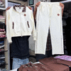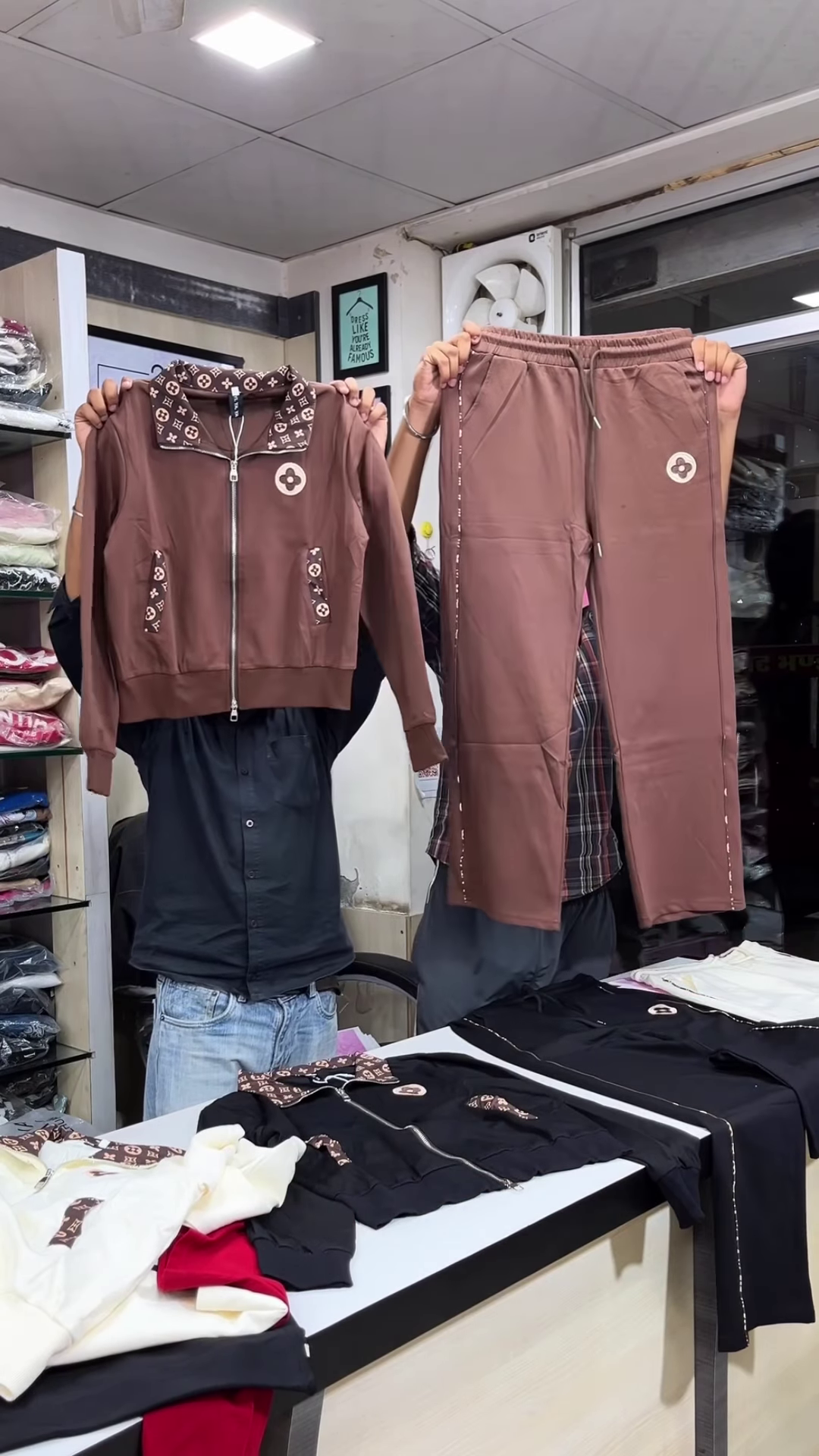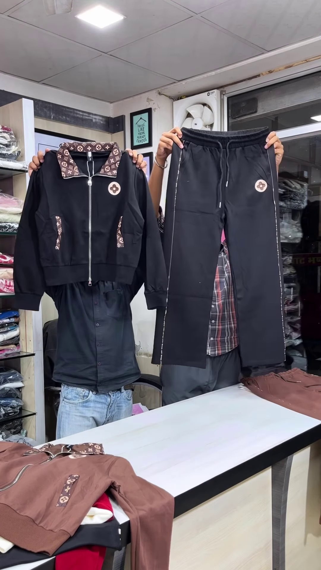 Both colorways are folded neatly on the counter, inviting admiration. Their coordinated designs speak to a thoughtful aesthetic—where every stitch tells a story, and every detail is intentional. Whether worn for a casual outing or styled for a fashion-forward moment, these tracksuits redefine what it means to be effortlessly chic. 💫👟