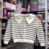 Retro charm meets modern layering in the Collar & Contrast Sweater Collection, a standout series of button-down knits designed for women who love bold details and timeless silhouettes. With its wide pointed collar, horizontal stripes, and warm-toned buttons, each piece delivers boutique elegance with a playful twist.