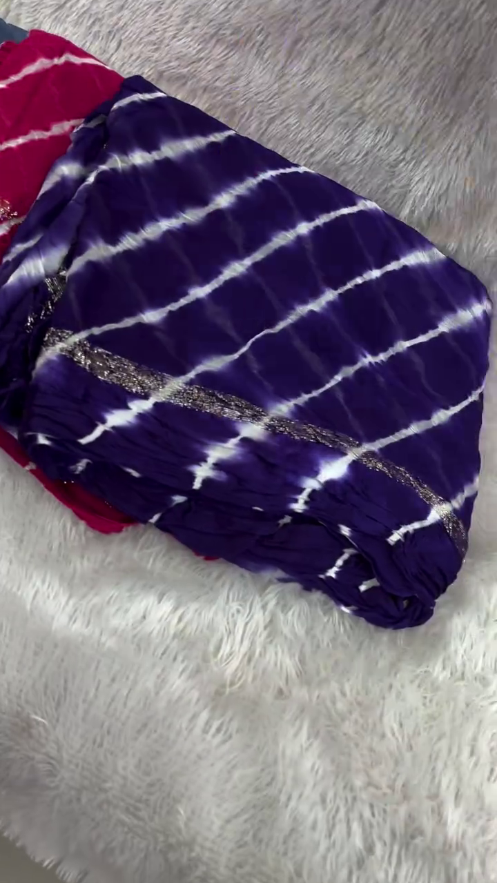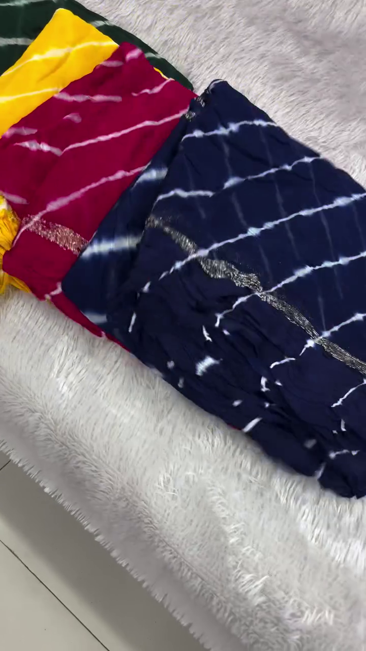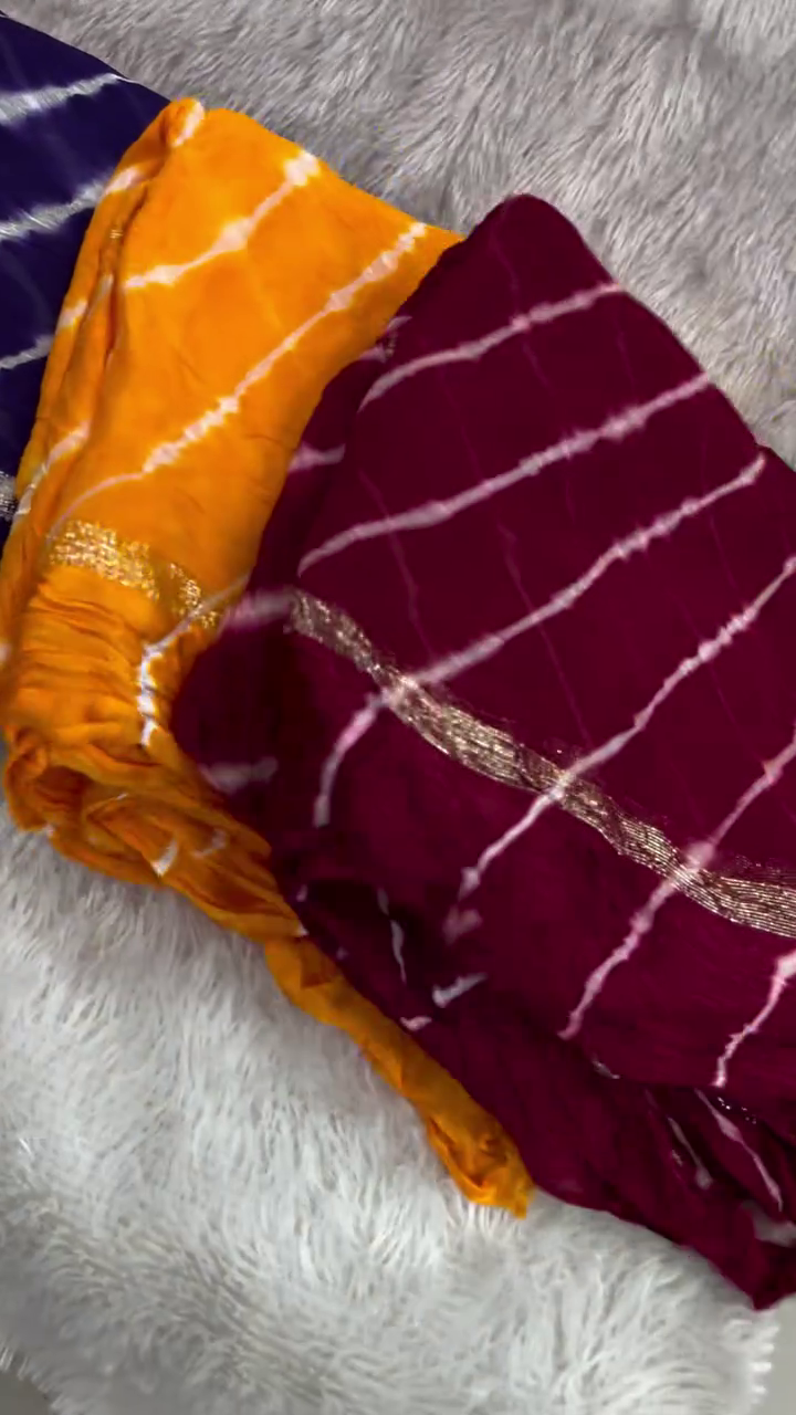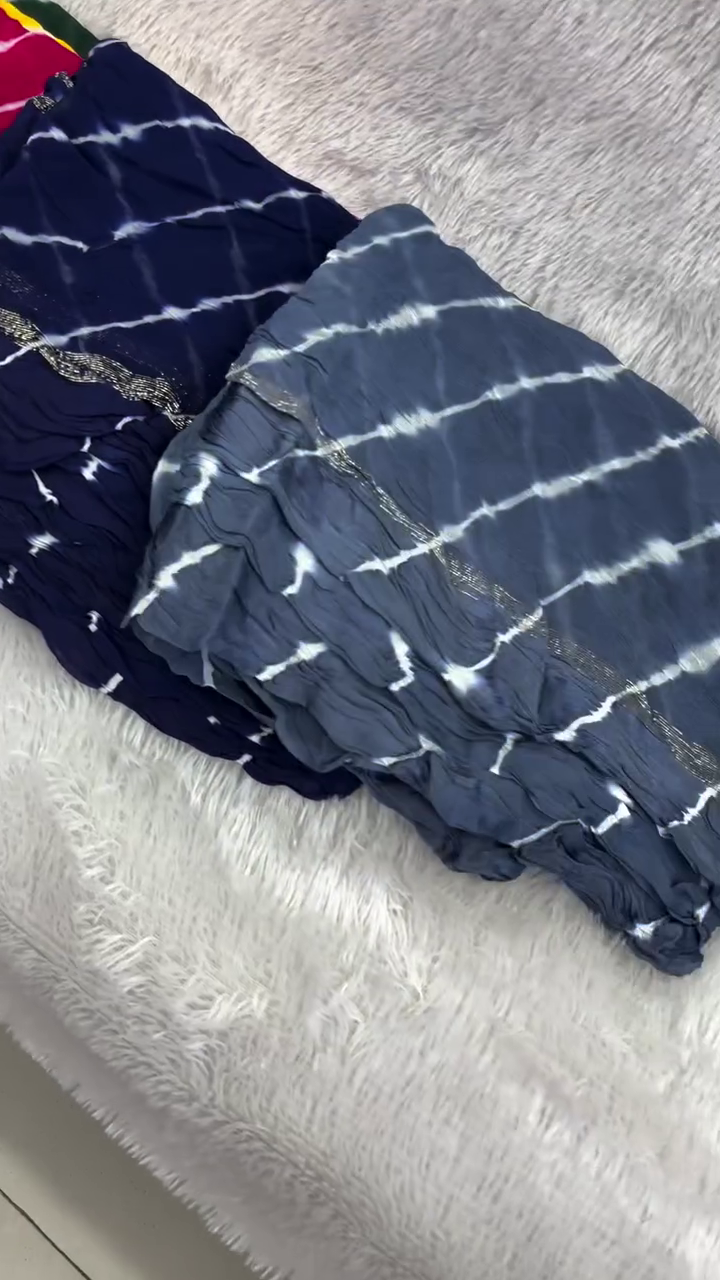 Lehariya (or Lahariya) is a traditional tie-dye technique from Rajasthan, India, characterized by its vibrant diagonal stripes that resemble waves. It is commonly created on lightweight fabrics like georgette, chiffon, or cotton, making it a popular choice for sarees, dupattas, and salwar suits.
