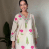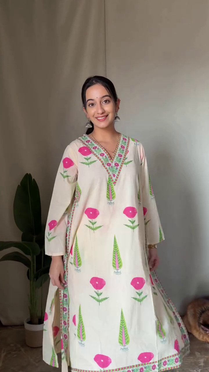 Step into effortless elegance with our Blush Bloom Cotton A-Line Kurta — a perfect blend of comfort, charm, and timeless ethnic style. Designed in a soft cream base adorned with vibrant pink floral motifs and fresh green accents, this kurta brings a refreshing touch to your everyday wardrobe.