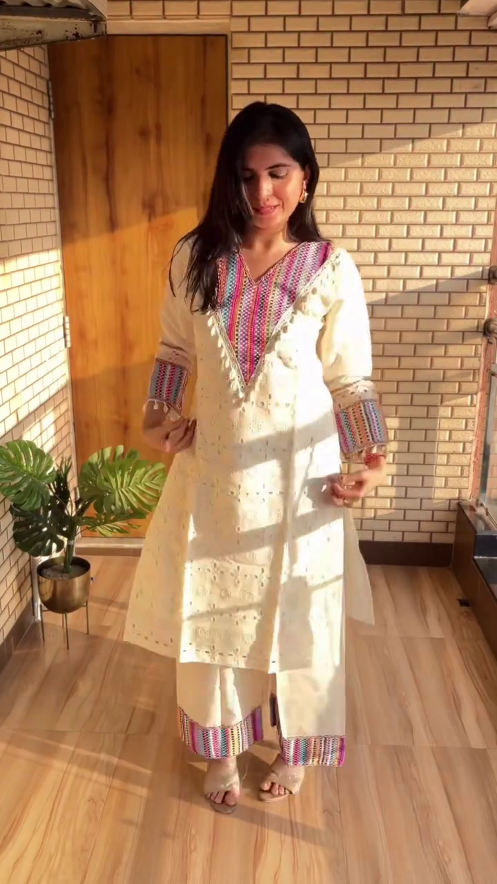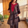 The straight-cut kurta features delicate tassel detailing at the neckline, adding a playful yet refined touch. Intricate floral embroidery along the hem and sleeves enhances the overall look with subtle craftsmanship, while the soft fabric ensures all-day comfort. Side slits offer ease of movement and a flattering silhouette.