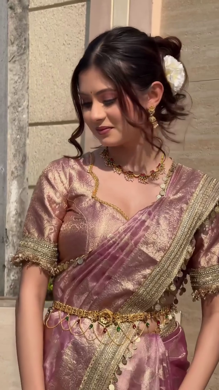 The highlight of this ensemble is its richly woven gold zari border, adorned with intricate detailing that adds depth, texture, and regal charm. Delicate embellishments along the edges enhance its grandeur while maintaining a balanced, classic appeal. The matching blouse showcases coordinated gold accents and fine craftsmanship, with elegant sleeve detailing and a flattering silhouette that elevates the overall look.