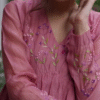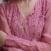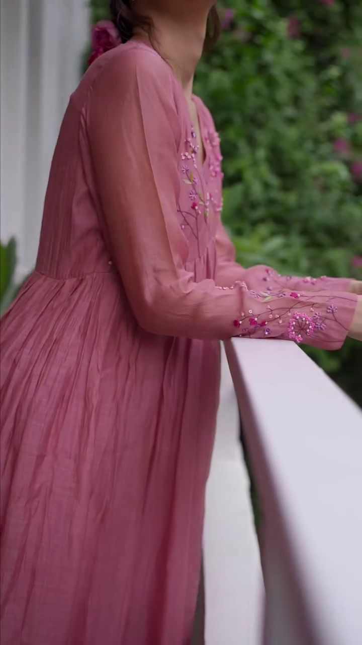 The soothing dusty rose hue creates a warm, feminine base, perfectly complemented by intricate floral embroidery across the neckline and sleeves. Fine threadwork in shades of lavender, pink, and green forms delicate vines and blossoms, adding depth and artistry to the design. Subtle sequin accents provide a gentle shimmer, catching the light without overwhelming the softness of the piece.
