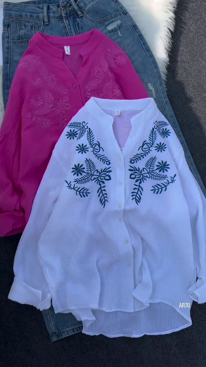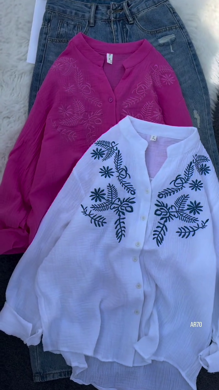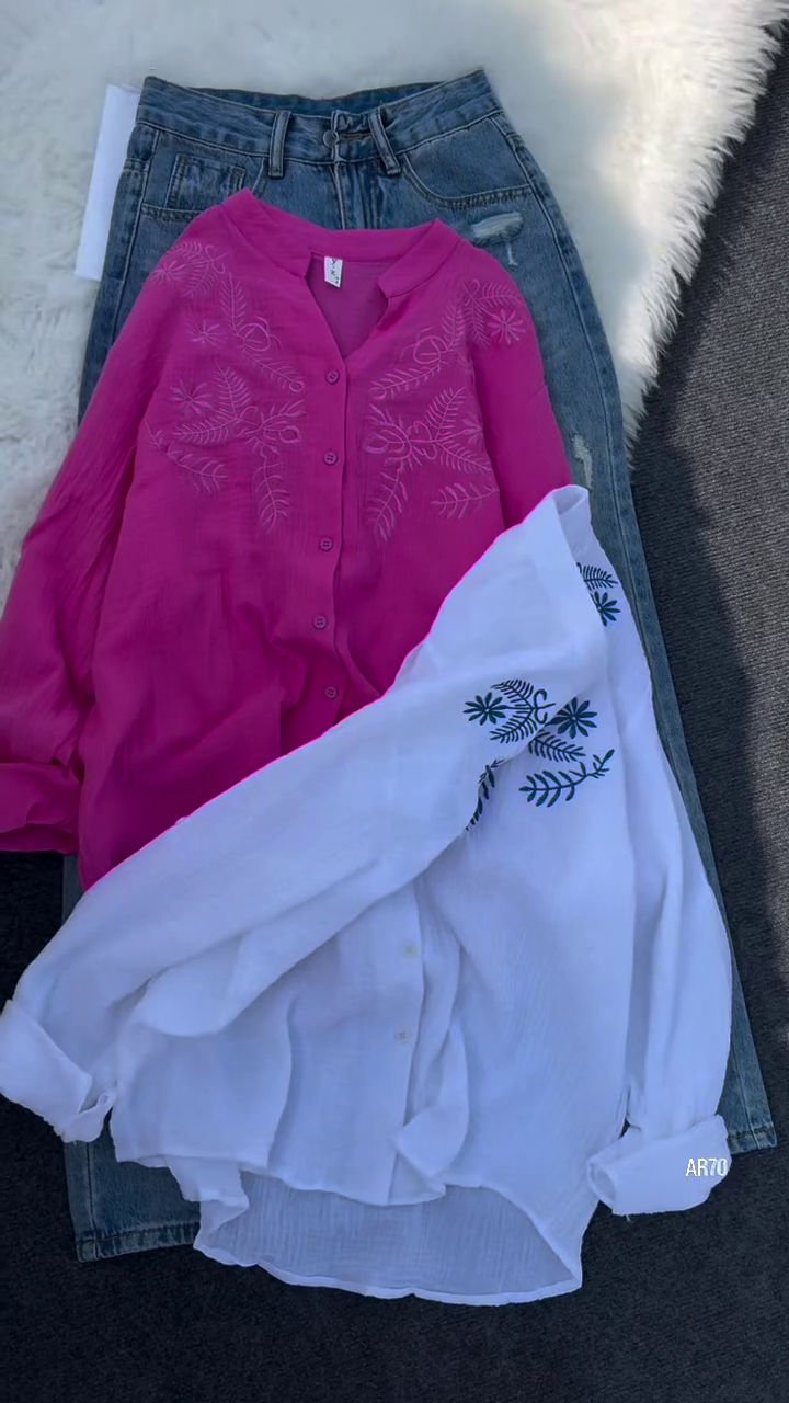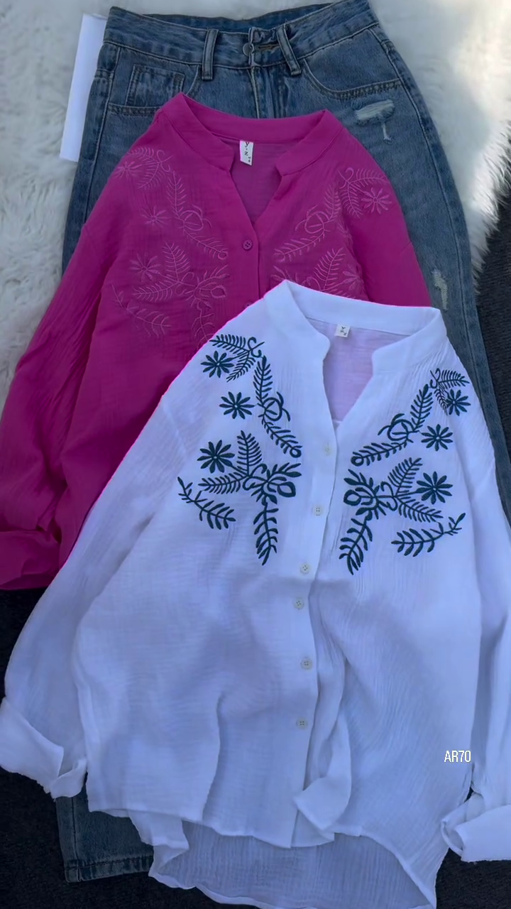 Made with soft and breathable fabric, it provides all-day comfort and a relaxed feel. The delicate embroidery on the front adds a unique and trendy touch, making it stand out from regular shirts. The button-down design gives you styling flexibility—you can wear it tucked in, open over a top, or styled with jeans.