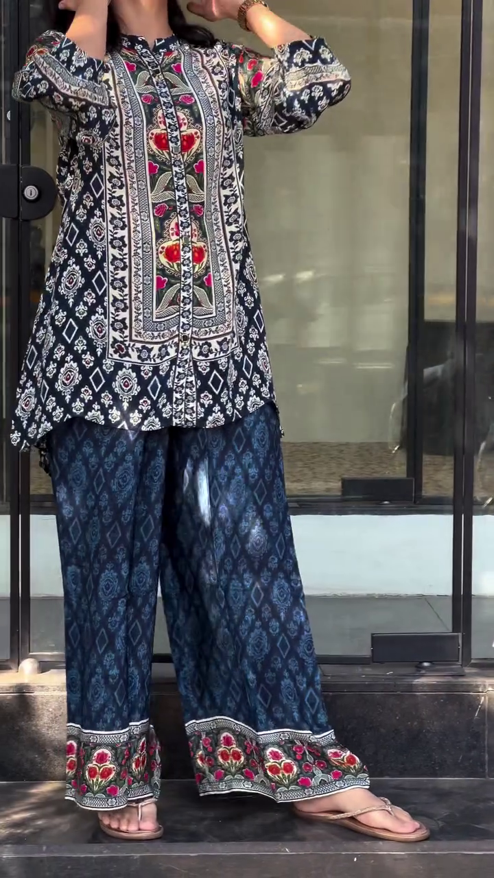Elegant Teal Floral Korean Co-Ord Set with Comfortable Bottom Wear