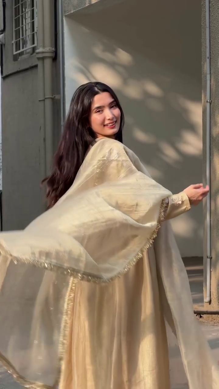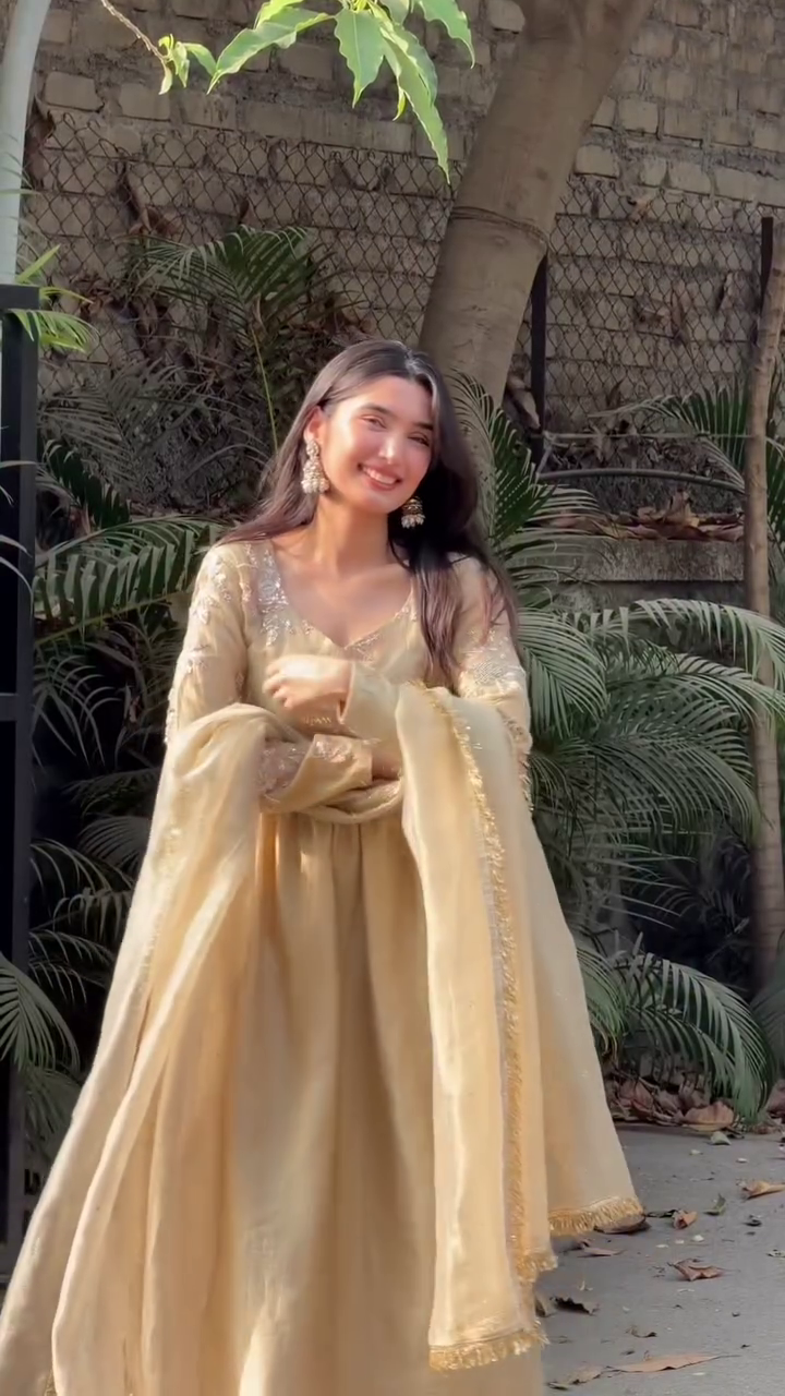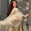 Crafted from lightweight, flowy fabric, the outfit drapes beautifully, creating a dreamy silhouette with every movement. The highlight of this set is its sheer dupatta, delicately finished with subtle shimmer detailing and fine fringed edges that add a touch of sophistication. The coordinated inner layer ensures comfort while maintaining a polished, seamless look.