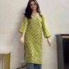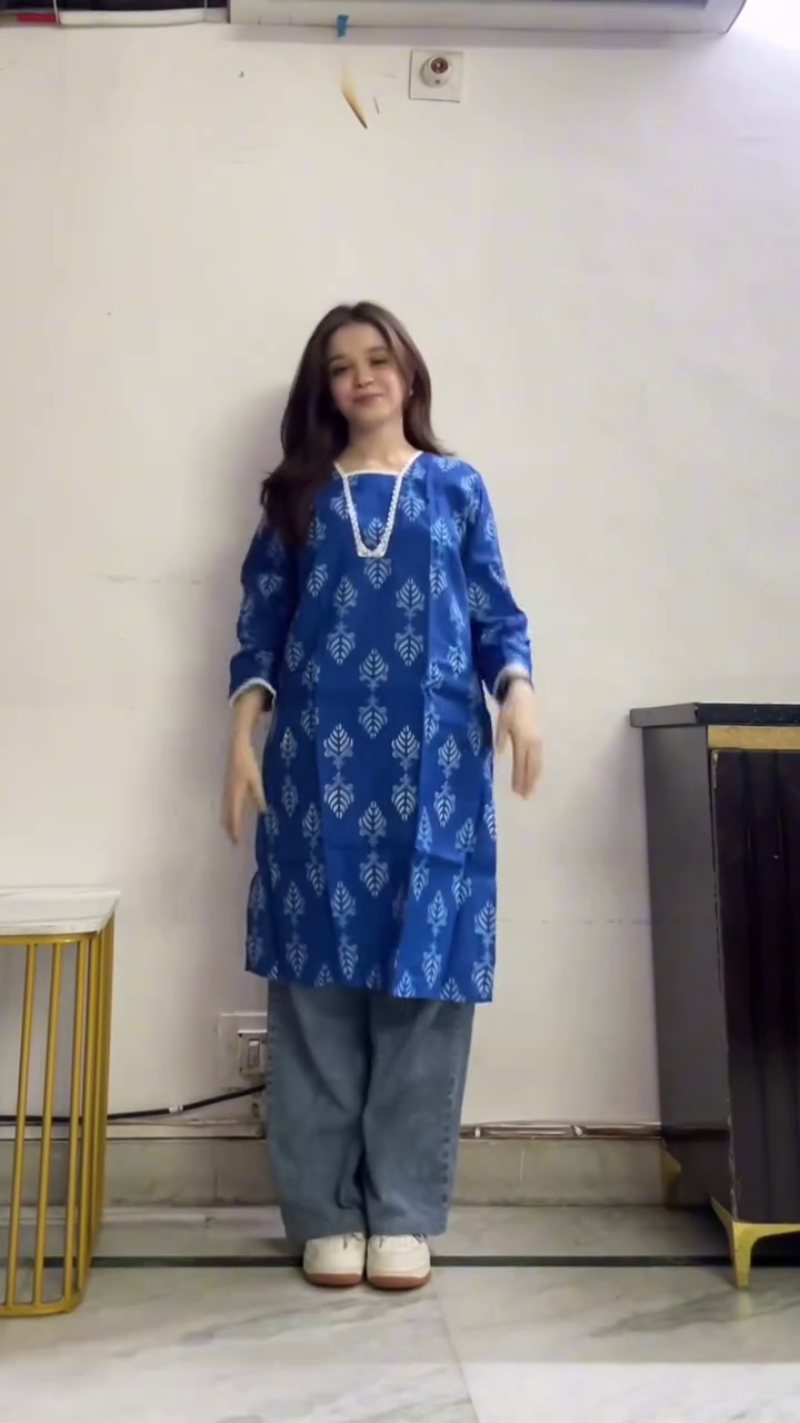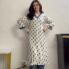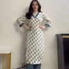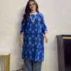 Crafted in a rich indigo-blue tone, the kurta features delicate all-over leaf motifs in soft contrasting prints that add subtle texture and visual appeal. The straight silhouette offers a relaxed yet structured fit, making it flattering for all body types. The three-quarter sleeves and simple round neckline enhance its minimal, easy-to-style aesthetic.