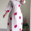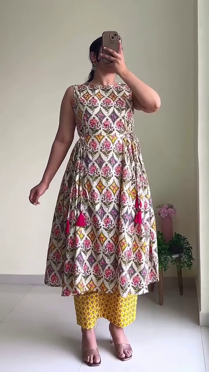 Fresh, vibrant, and effortlessly graceful — the Ivory Bloom Printed Layered Dress Set is designed to make everyday dressing feel special. Crafted in a soft ivory base, this sleeveless flared dress features an intricate all-over floral and geometric print in rich pink, mustard, and earthy tones, creating a beautifully balanced ethnic aesthetic.