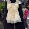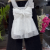 The ivory top features delicate sheer shoulder straps and a softly ruched bodice that enhances the shape beautifully. A statement bow detail at the front adds a romantic touch, while subtle embellishments along the neckline bring a hint of sparkle. The layered, flowy hem creates movement and gives the top a light, airy feel — perfect for both day and evening styling.