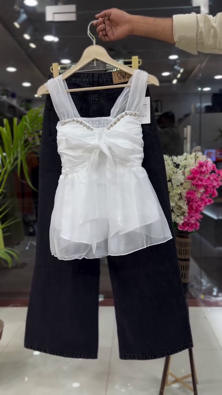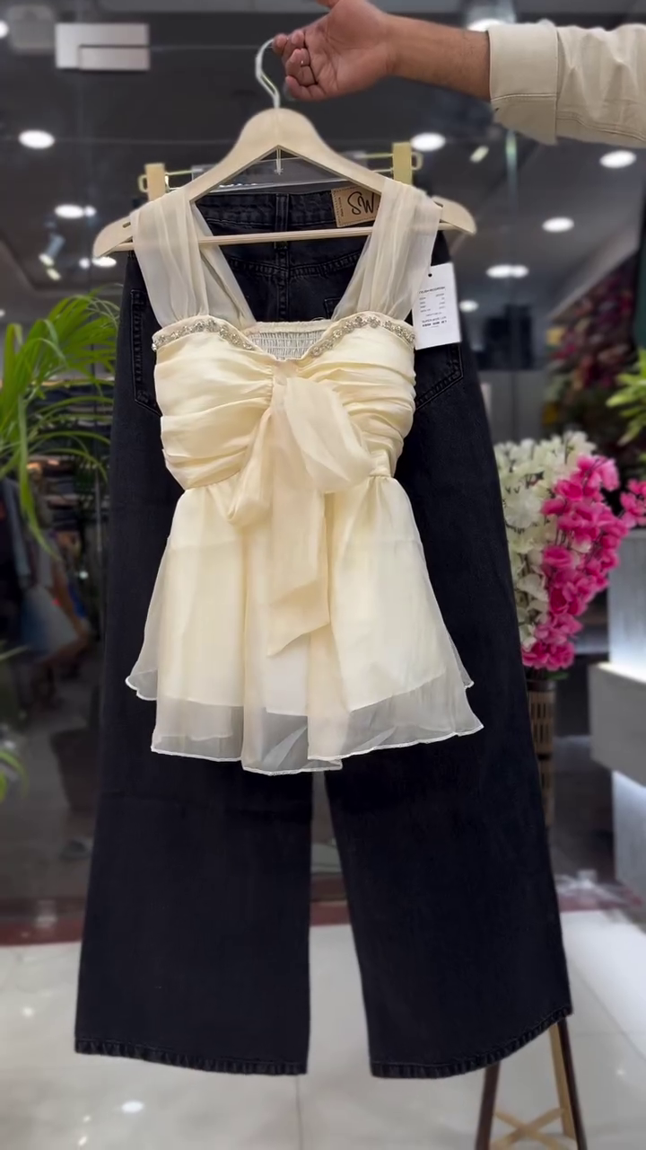 Chic, playful, and effortlessly stylish, this Ivory Sheer Bow Detail Top paired with Black Wide-Leg Denim creates a statement look with modern flair. Designed to blend softness with structure, this outfit is perfect for those who love feminine silhouettes with a contemporary edge.