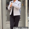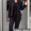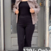 Beneath, the black base layers provide a sleek contrast that anchors the outfit with minimalist appeal. The fitted black top and pants create a flattering foundation that balances the jacket’s softness and adds a polished, put-together vibe.