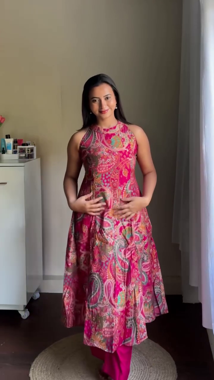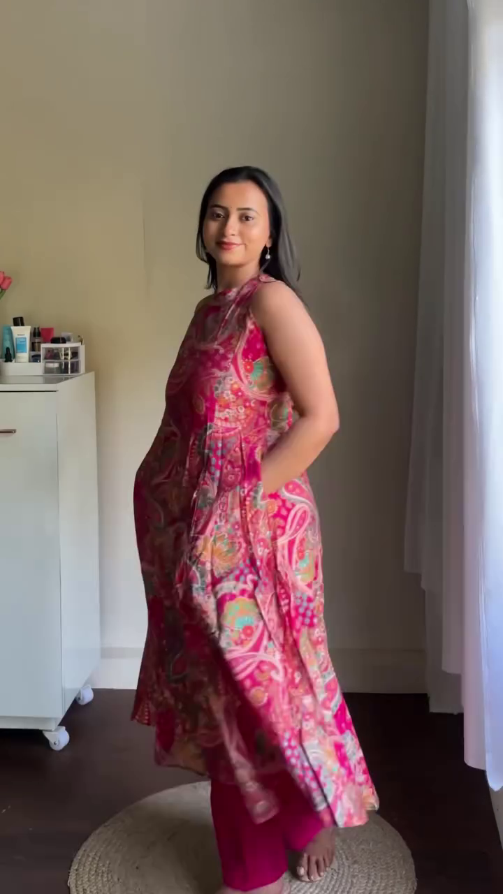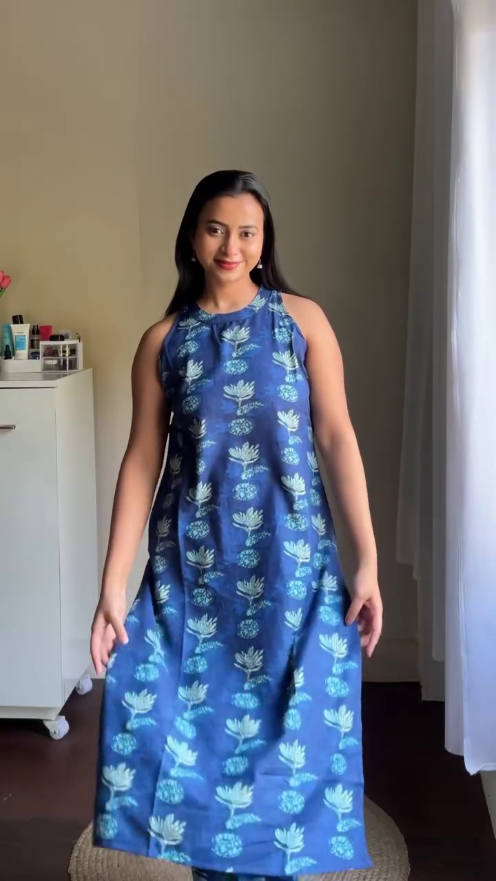 Crafted in a lightweight, breathable fabric, the silhouette flows gracefully from the shoulders into a relaxed A-line shape, offering a flattering drape for all body types. The sleeveless cut and high neckline create a modern, clean look, while the roomy flare ensures ease of movement and all-day comfort.