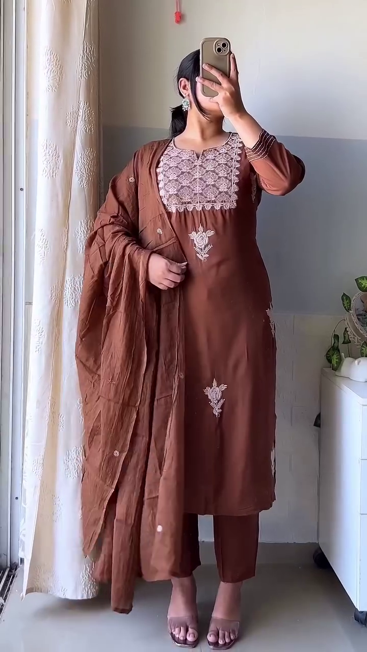 Elevate your ethnic wardrobe with this beautifully crafted Rust Elegance Embroidered Kurta Set, designed to blend sophistication with everyday comfort. Drenched in a rich earthy brown hue, this ensemble radiates warmth and understated luxury, making it a perfect choice for festive gatherings, family functions, and intimate celebrations.