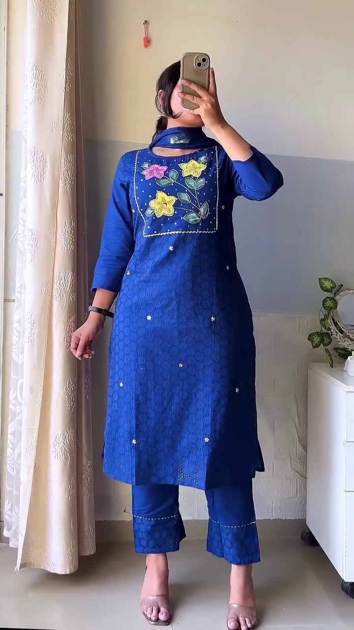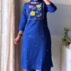 The kurta features intricate thread embroidery on the neckline, creating a delicate focal point that enhances its classic appeal. Subtle floral motifs placed gracefully along the front add charm without overwhelming the design. The straight-cut silhouette offers a flattering fit, while the three-quarter sleeves provide a balanced, elegant finish. Paired with matching straight pants, the set creates a seamless and refined look.
