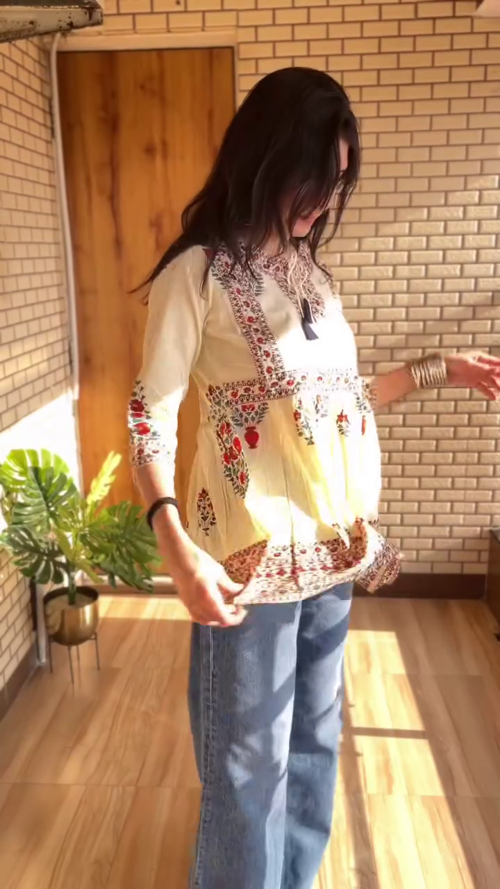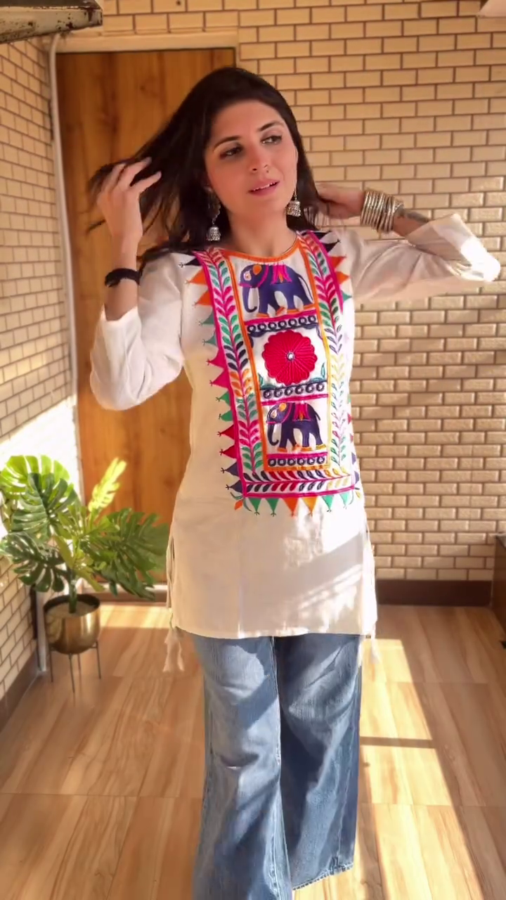 Paired effortlessly with ivory wide-leg pants or palazzos, this kurti creates a striking contrast that feels both bold and elegant. The lightweight fabric ensures comfort while maintaining a structured, polished look.