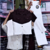 The jacket stands out with its structured design, button-down front, and dual chest pockets that add a cool utility vibe. The olive upper panel blends beautifully with the crisp white lower section, making the jacket both eye-catching and versatile. Its cropped length gives a modern silhouette that pairs perfectly with high-waist bottoms.