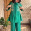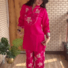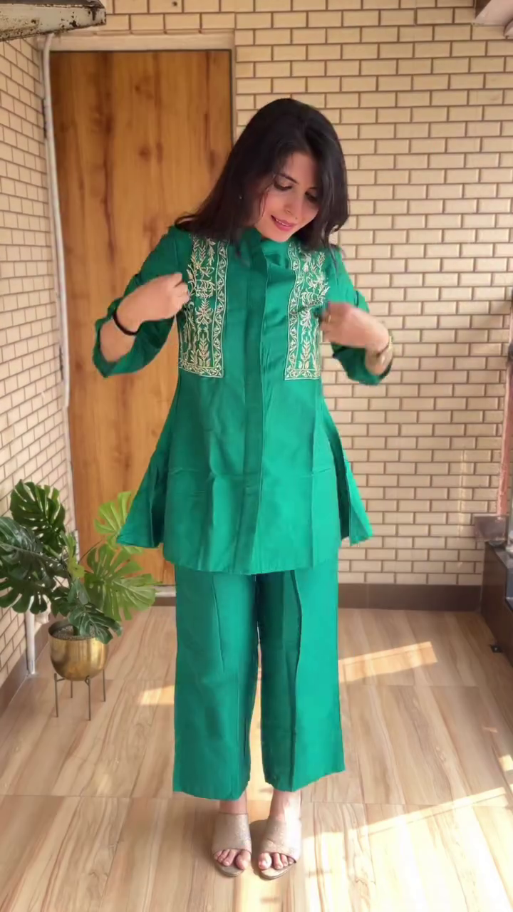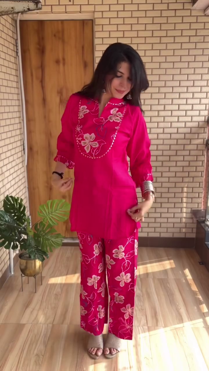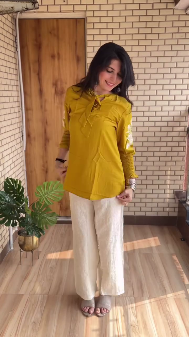 Paired with flowy off-white textured palazzos, this set creates a beautiful contrast that feels fresh and timeless. The wide-leg bottoms add movement and comfort, making it an ideal choice for long days when you want to look put-together yet feel relaxed.