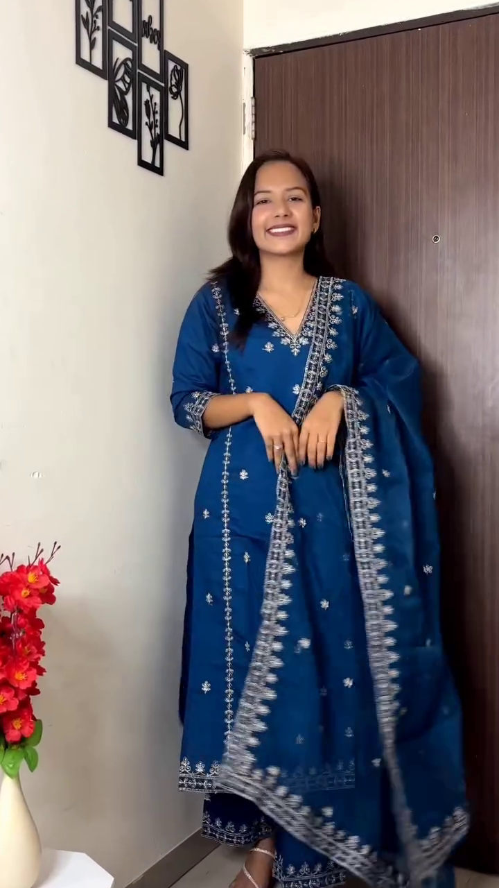 The straight-fit kurta features intricate embroidery along the neckline, highlighted with delicate threadwork that adds depth and charm. The three-quarter sleeves and clean silhouette create a flattering structure, ensuring both comfort and sophistication. The matching bottoms complete the coordinated look with a polished finish.