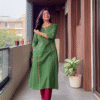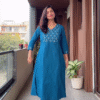 Crafted in a soothing teal hue, the kurta features delicate geometric-inspired embroidery across the yoke, adding texture and charm without overpowering the look. The subtle threadwork enhances the neckline and creates a structured yet graceful appearance. Three-quarter sleeves with minimal detailing complete the design, offering both comfort and style.
